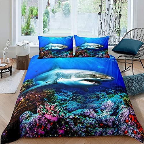 MOUMOUHOME Twin Size Shark Bedding Kids Gift 3D Shark Jumping from Ocean Big Open Mouth Printed Blue Duvet Cover Bed Sets with Zipper for Boys Girls 2 ...