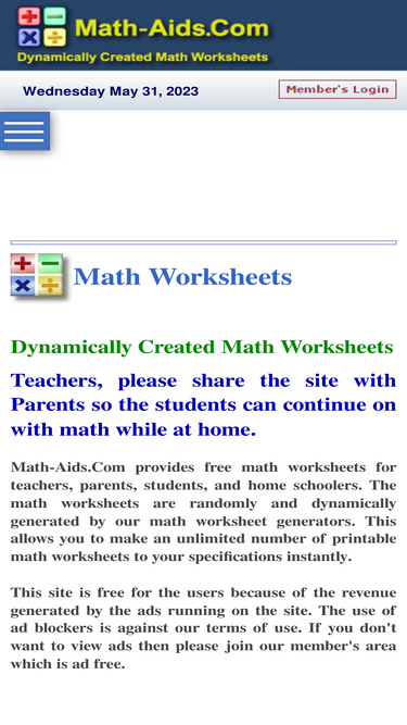 Math-Aids - TeacherSherpa Math-Aids.Com provides free math worksheets for teachers, parents, students, and home schoolers. The math worksheets are randomly and dynamically generated by our math worksheet generators. This allows you to make an unlimited number of printable math worksheets to your specifications instantly. Folders & My Work Followers All your work Go Ad-Free